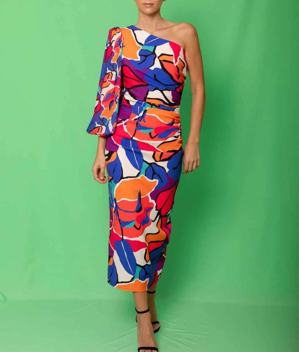 Asymmetrical printed dress with gathers and puffed chiffon sleeves.
