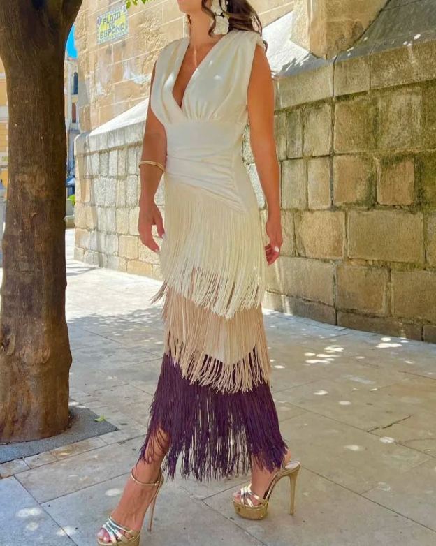An elegant V-neck gradient fringed maxi dress, designed with a flattering plunging neckline and flowing ombre fringe layers. The flowing movement of the fringe accentuates every step, while the gradient colors create a captivating visual impact—ideal for cocktail parties, stage performances, and special occasions.