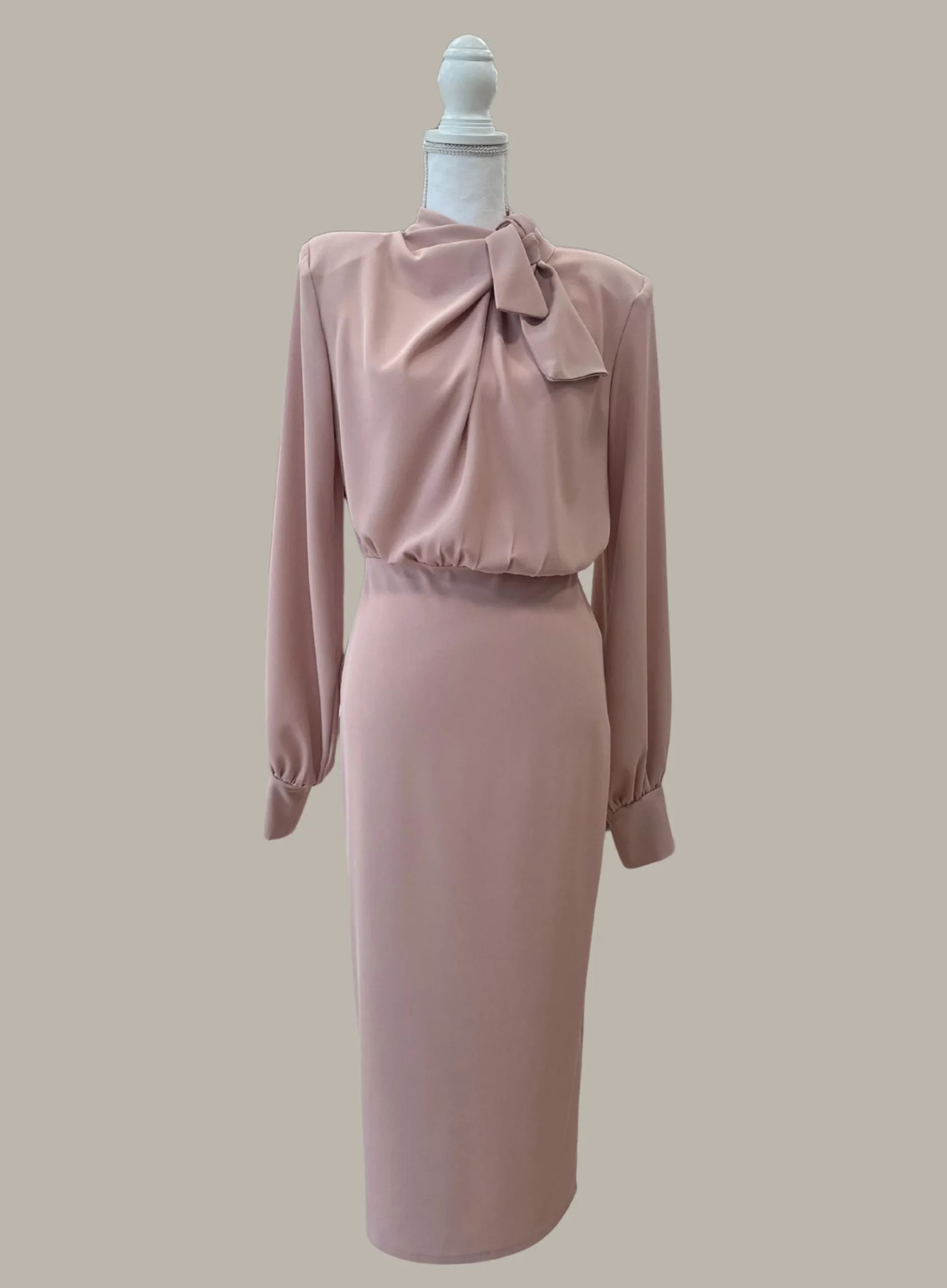 Two-piece mock dress with puff sleeves and cuffs. Tie at the neck.