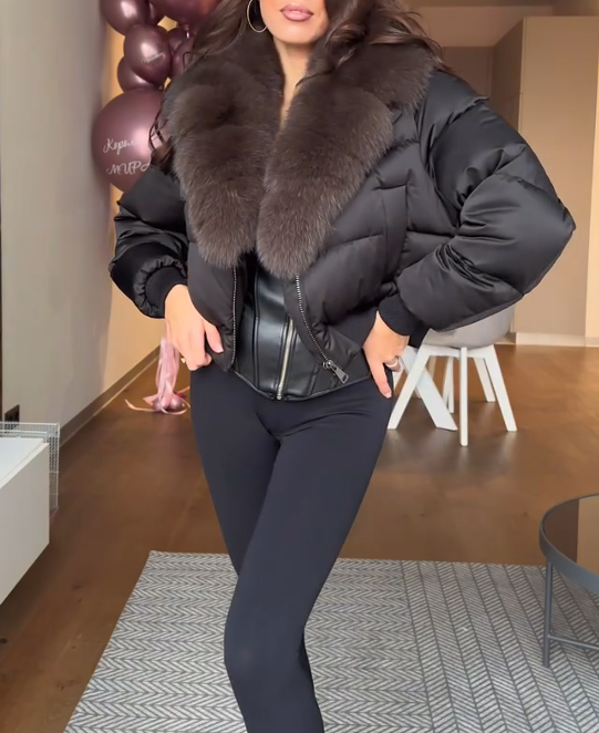 ESTILO: La chaqueta presenta un diseño corto que es simple y elegante. El cuello de piel se abre para envolver el cuello, añadiendo un toque de lujo y calidez. El estilo general es moderno y chic, adecuado para todas las ocasiones.